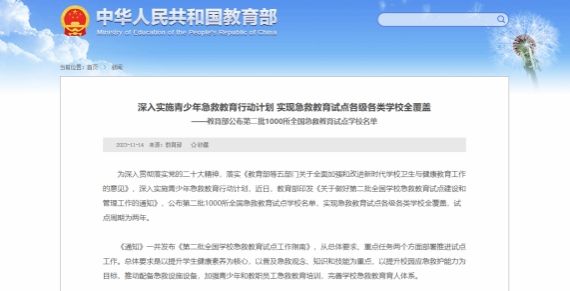 教育部此次公布第二批全国学校急救教育试点学校,旨在加强全国学校急救教育工作,提高广大师生应对突发事件和意外伤害的自救互救能力,有效降低校园意外伤害事故的发生率。入选急救教育试点学校的学校将通过开展急救教育培训、搭建急救教育资源平台、加强应急救护师资队伍建设等工作,以期为全国学校急救教育提供可借鉴、可推广的经验和模式。