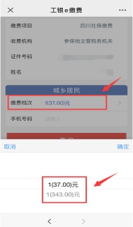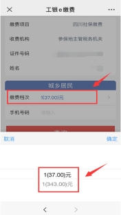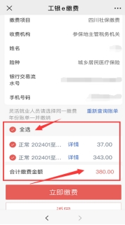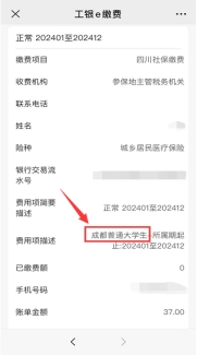 (1)关注微信公众号“成都税务”→“我要办事”→“社保缴费”→ 选取任一银行缴费(以工行为例)→填写个人信息→点查询按钮→选择缴费年份:2024年;社保经办机构:金牛区医疗保障局→选缴费档次(任选一个)→点查询按钮→点全选,完成缴费,总费用380元。(点任意一个详情查看显示为“成都普通大学生”)