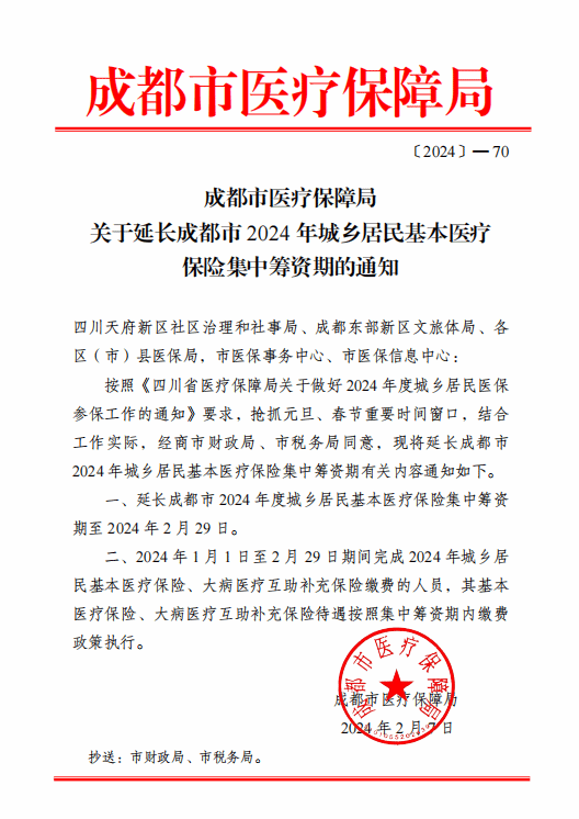关于延长成都市 2024 年城乡居民基本医疗保险集中筹资期的通知