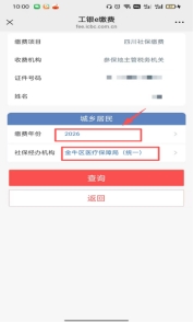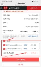 关注微信公众号“成都税务”→“我要办事”→“社保缴费”→ 选取任一银行缴费(以工行为例)→填写个人信息→点击查询按钮→选择缴费年份:2026年;社保经办机构:金牛区医疗保障局→选择缴费档次(任选一个)→点击查询按钮→点击全选,完成缴费,总费用448元(点击任意一个详情查看显示为“成都普通大学生”)。